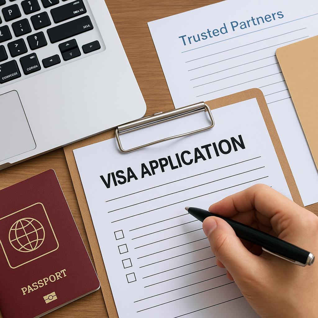 Проверяйте список доверенных партнёров на официальных сайтах или в визовых центрах, чтобы не попасть на мошенников.