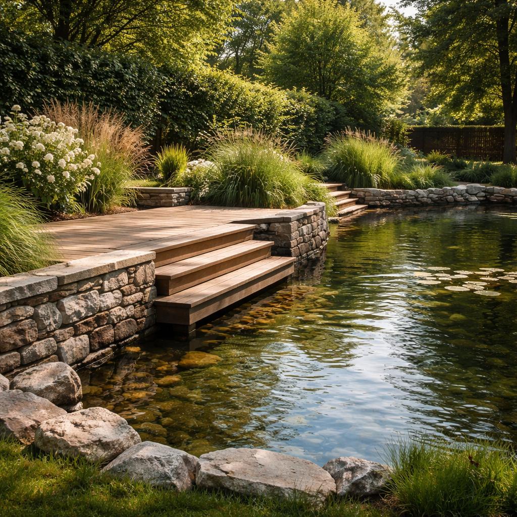 Пруд живёт десятилетиями, если его кромка воды продумана как конструкция. Тогда пирсы не перекашиваются, камень не уходит в ил, настил остаётся устойчивым, а подход к воде сохраняет аккуратный вид. В таком пространстве приятно находиться — и летом, и в межсезонье.